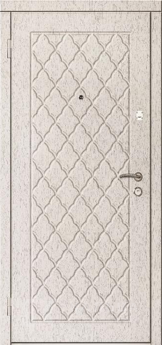 Фото №2 «Входная дверь для квартиры белая графика снаружи светлые ромбы внутри №90»