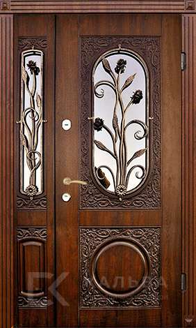 Фото «Железная дверь для частного дома с овальным стеклом и ковкой №102»