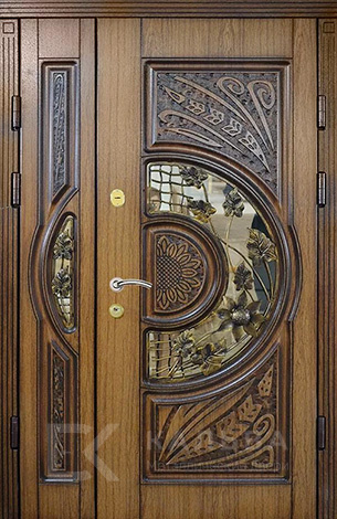 Фото «Стальная полуторная дверь светлый дуб со стеклом и кованым декором №103»