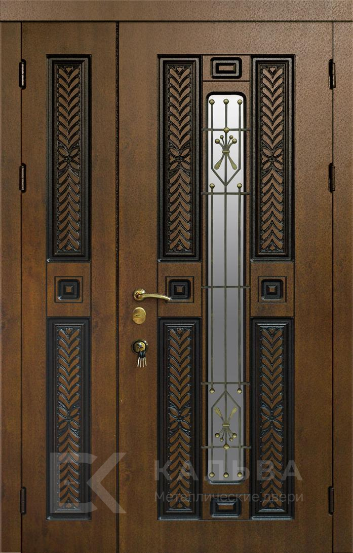 Фото «Железная двустворчатая дверь в цвете орех с узким стеклопакетом №353»