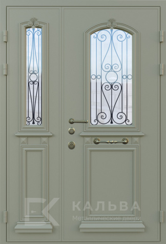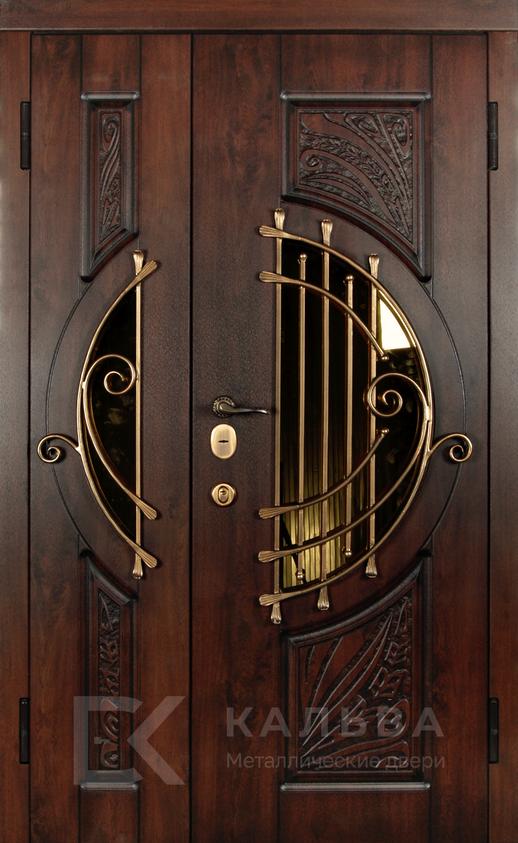 Фото «Железная двустворчатая дверь венге с круглым остеклением и кованым узором №361»